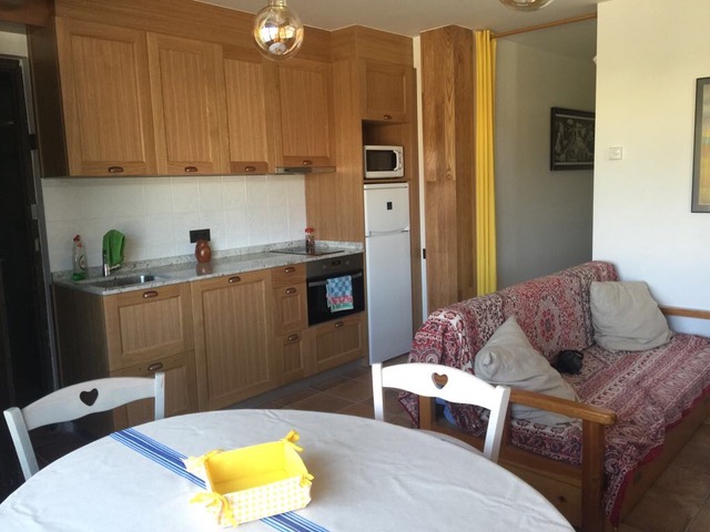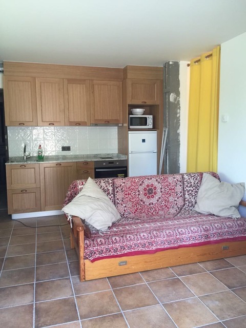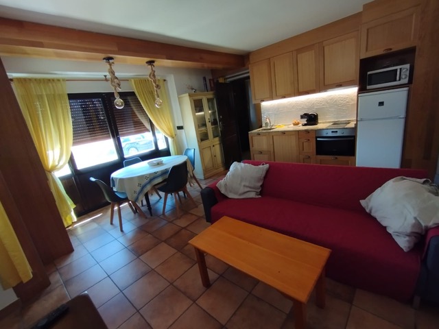 - Sala de estar/cocina con un gran ventanal con vistas al Pirineo